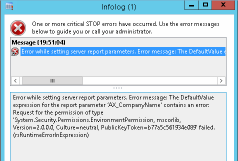 "Error while setting server report parameters. Error message: The DefaultValue expression for the report parameter 'AX_CompanyName' contains an error:"