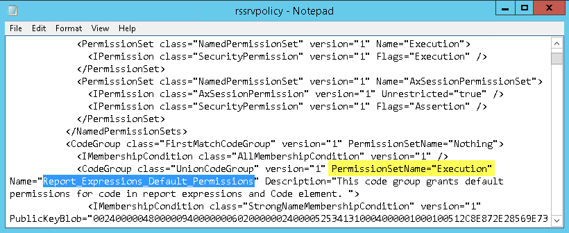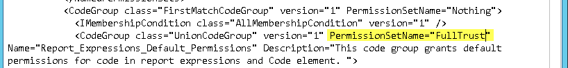 This file may contain a lot of content, so try search for "Report_Expressions_Default_Permissions" and you should only find one occurrence of that text. Now the value you're looking for is "Execute" and you want to change that to "FullTrust".