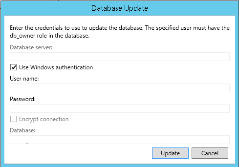 So click the "Update the Management Reporter database"-text and let it help you upgrade the database schema to the latest version. A dialog will pop up and you should be able to update the schema in the context of your current user. Hit Update and wait.