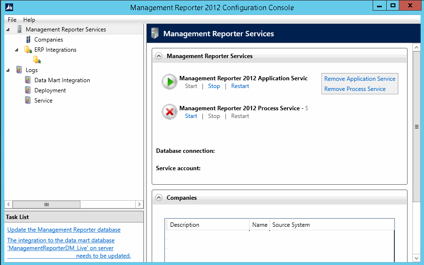 When the Configuration Console has loaded you will notice in the bottom left hand side the "tasks" necessary to complete for Management Reporter to be ready on the latest updated version.